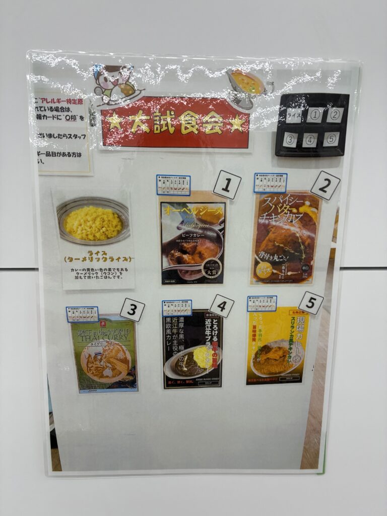 試食の内容は、オーベルジーヌ、スパイシーバターチキンカレー、タイグリーンカレー、近江ブラックカレー、スリランカ風チキンカレー全5種類のキャニオンスパイス自慢のラインナップ!