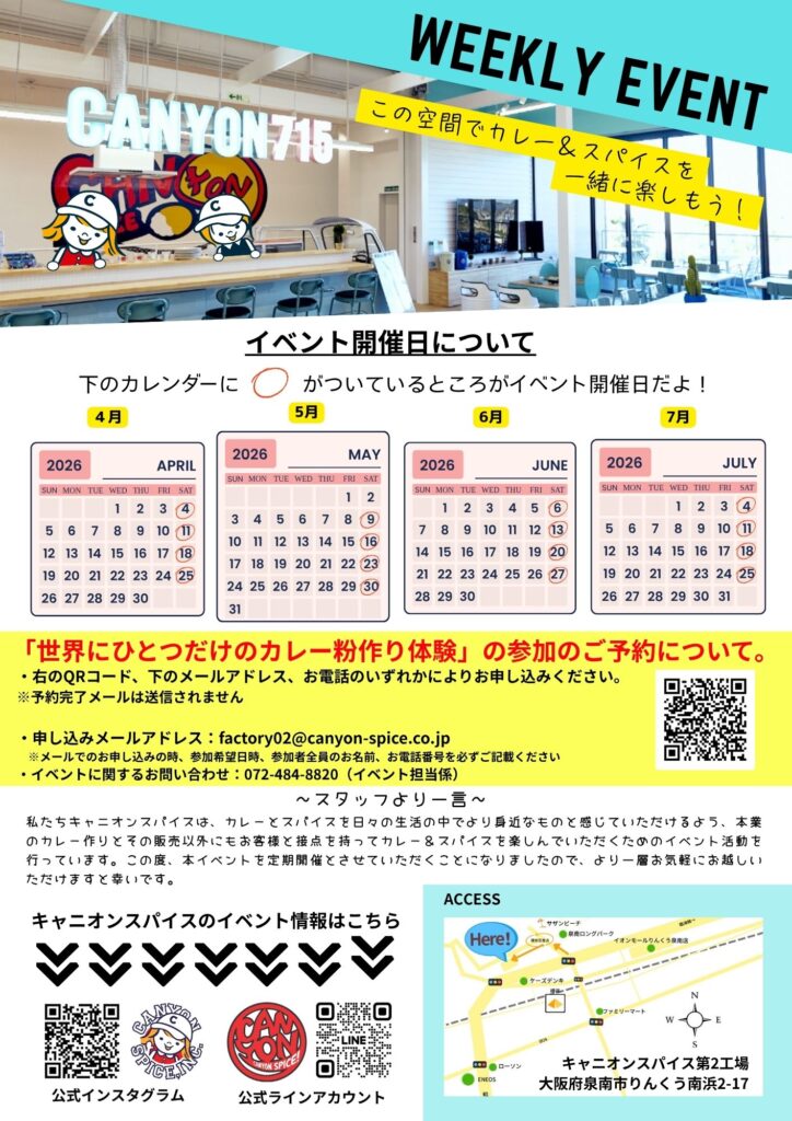 ✉メール:factory02@canyon-spice.co.jp ※参加希望日時、代表名、人数を必ずご記載ください