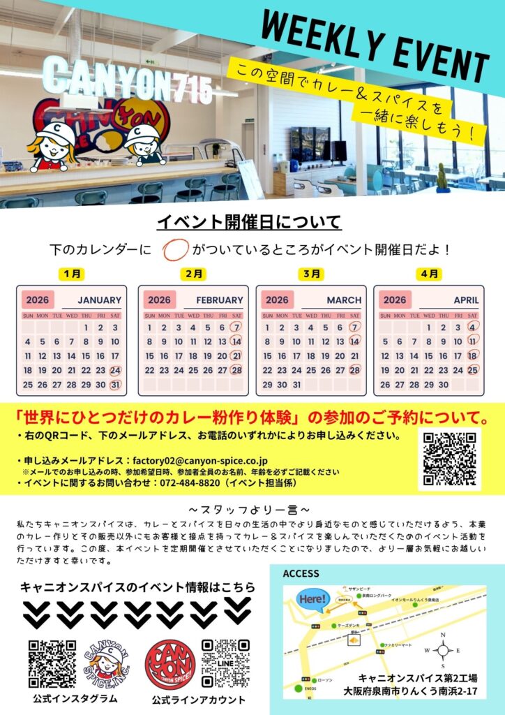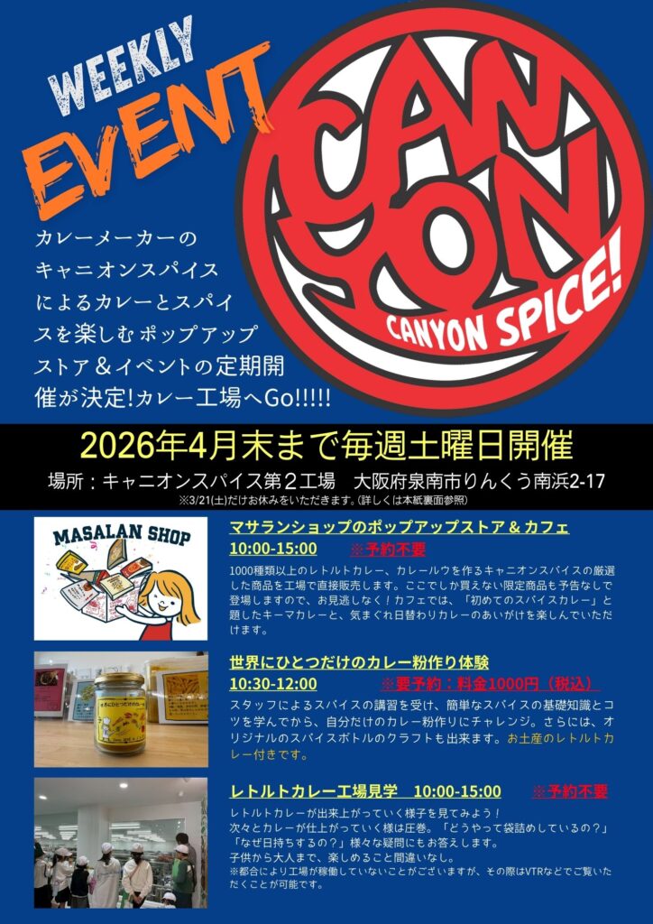 新年最初のご案内として、キャニオンスパイス初の試みとなるキャニオンスパイス第2工場で、毎週土曜日のイベント開催が決定しました。