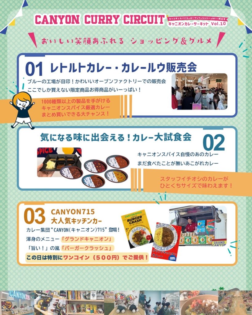 ブルーの工場が目印のオープンファクトリーで、1000種類以上の製品を手がけるキャニオンスパイス厳選カレーをまとめ買いできる大チャンス!ここでしか買えない限定商品やお得商品がずらりと並びます。