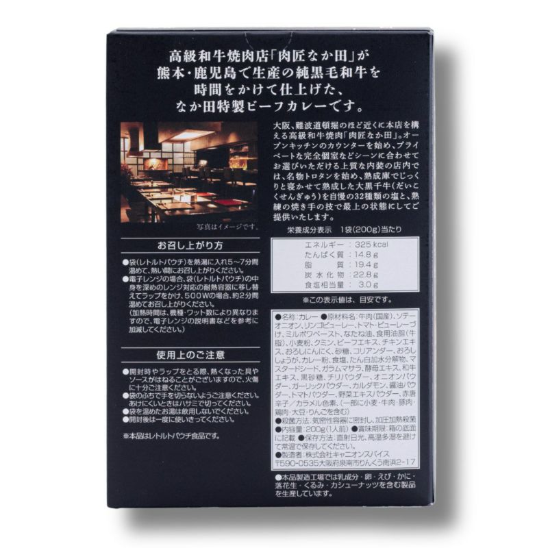| 原材料 | 牛肉(国産)、ソテーオニオン、リンゴピューレー、トマト・ピューレーづけ、ミルポワペースト、なたね油、食用油脂(牛脂)、小麦粉、クミン、ビーフエキス、チキンエキス、おろしにんにく、砂糖、コリアンダー、おろししょうが、カレー粉、食塩、たん白加水分解物、マスタードシード、ガラムマサラ、酵母エキス、和牛エキス、黒砂糖、チリパウダー、オニオンパウダー、ガーリックパウダー、カルダモン、醤油パウダー、トマトパウダー、野菜エキスパウダー、赤唐辛子/カラメル色素、(一部に小麦・牛肉・豚肉・鶏肉・大豆・りんごを含む) |