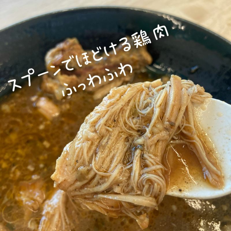 昆布とかつおのベースに、鶏と豚の旨味が足され、デミグラスソースやトマトなどが相まって、どこまでも濃厚に仕立てられたカレースープ。具材の大きな骨付きチキンはじっくり焼かれてしっかりとした下味がついており、その濃厚なスープと相性抜群。