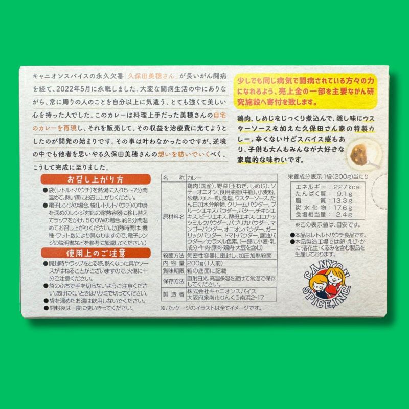 原材料 | 鶏肉(国産)、野菜(玉ねぎ、しめじ)、ソテーオニオン、食用油脂(牛脂)、小麦粉、砂糖、カレー粉、食塩、ウスターソース、たん白加水分解物、クリームパウダー、プルーンエキスパウダー、バター、チキンエキス、ビーフエキス、酵母エキス、ココナッツミルクパウダー、パプリカパウダー、マンゴーパウダー、オニオンパウダー、ガーリックパウダー、トマトパウダー、醤油パウダー/カラメル色素、(一部に小麦・乳成分・牛肉・豚肉・鶏肉・大豆を含む) |