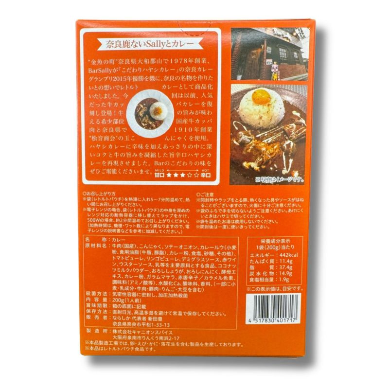 | 原材料 | 牛肉(国産)、こんにゃく、ソテーオニオン、カレールウ(小麦粉、食用油脂(牛脂、豚脂)、カレー粉、食塩、砂糖、その他)、トマトピューレー、リンゴピューレー、デミグラスソース、赤ワイン、ウスターソース、乳等を主原料とする食品、ココナッツミルクパウダー、おろししょうが、おろしにんにく、酵母エキス、カレー粉、ガラムマサラ、赤唐辛子/カラメル色素、調味料(アミノ酸等)、水酸化Ca、酸味料、香料、(一部に小麦・乳成分・牛肉・豚肉・りんご・大豆を含む) |