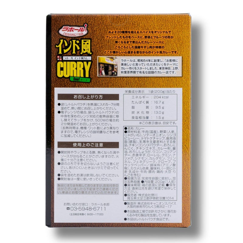 | 原材料 | 牛肉(国産)、野菜(人参、じゃがいも)、ソテーオニオン、リンゴピューレー、トマトケチャップ、食用油脂(豚脂)、乳等を主原料とする食品、チキンコンソメパウダー、おろしにんにく、チキンエキス、カレー粉、醤油、おろししょうが、ウコン、コリアンダー、ローレル、クミン、ナツメグ、シナモン、カルダモン、フェンネル、フェネグリーク、クローブ、ブラックペッパー/調味料(アミノ酸等)、カラメル色素、酸味料、(一部に小麦・乳成分・牛肉・豚肉・鶏肉・大豆・りんごを含む) |