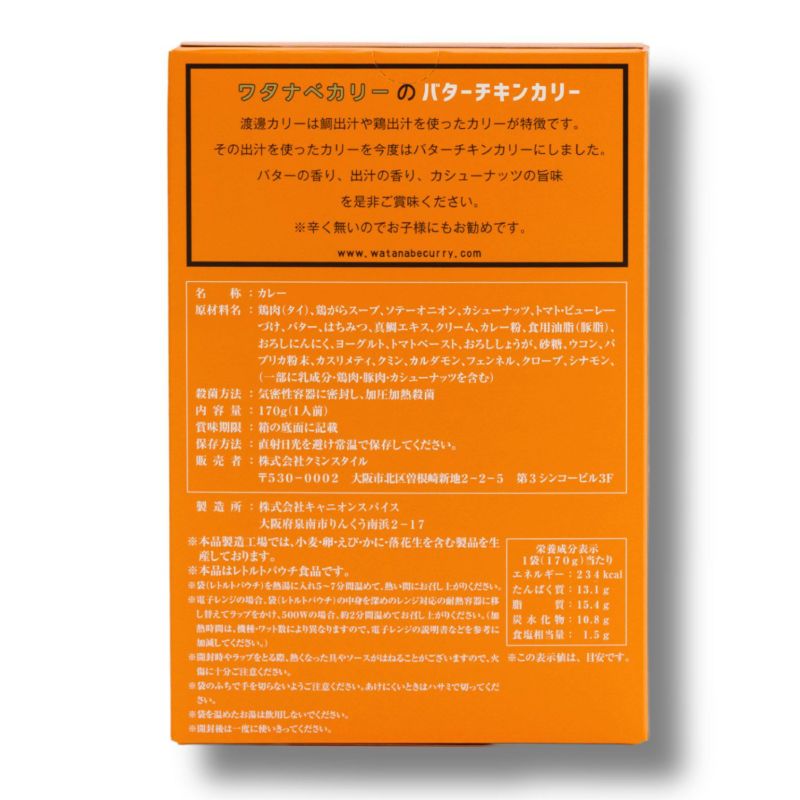 | 原材料 | 鶏肉(タイ)、鶏がらスープ、ソテーオニオン、カシューナッツ、トマト・ピューレーづけ、バター、はちみつ、真鯛エキス、クリーム、カレー粉、食用油脂(豚脂)、おろしにんにく、ヨーグルト、トマトペースト、おろししょうが、砂糖、ウコン、パプリカ粉末、カスリメティ、クミン、カルダモン、フェンネル、クローブ、シナモン、(一部に乳成分・鶏肉・豚肉・カシューナッツを含む) |