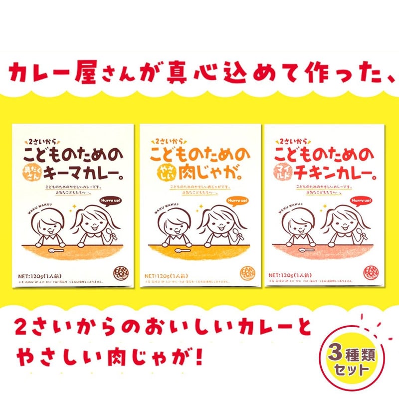 | 原材料 | 【こどものための具だくさんキーマカレー。】野菜(人参、じゃがいも)、豚肉(国産)、ソテーオニオン、鶏がらスープ、リンゴピューレー、でん粉、植物油脂(菜種)、粗糖、トマトケチャップ、おろしにんにく、おろししょうが、酵母エキス、チャツネ、トマトペースト、食塩、カレー粉、ウコン、(一部に豚肉・鶏肉・りんごを含む) 【こどものためのマイルドチキンカレー。】さつまいも(国産)、ソテーオニオン、鶏肉、鶏がらスープ、でん粉、植物油脂(菜種)、粗糖、無調整豆乳、ココナッツミルク、トマトピューレー、トマトケチャップ、おろしにんにく、トマトペースト、おろししょうが、酵母エキス、カレー粉、パプリカパウダー、ウコン、食塩、(一部に鶏肉・大豆を含む) 【こどものためのやさしい肉じゃが】 野菜(じゃがいも、人参)(国産)、ソテーオニオン、鶏がらスープ、牛肉、でん粉、粗糖、甘酒、醤油、植物油脂(菜種)、昆布、かつおパウダー、酵母エキス、(一部に牛肉・鶏肉・大豆を含む) | |