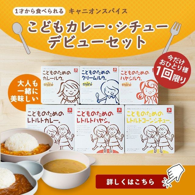 | 内容量 | こどものためのカレールウ。mini(75g・約3皿分) こどものためのクリームルウ。mini(75g・約3皿分) こどものためのハヤシルウ。mini(75g・約3皿分) こどものためのレトルトカレー。(80g×2袋) こどものためのレトルトコーンシチュー。(80g×2袋) こどものためのレトルトハヤシ。(80g×2袋) |